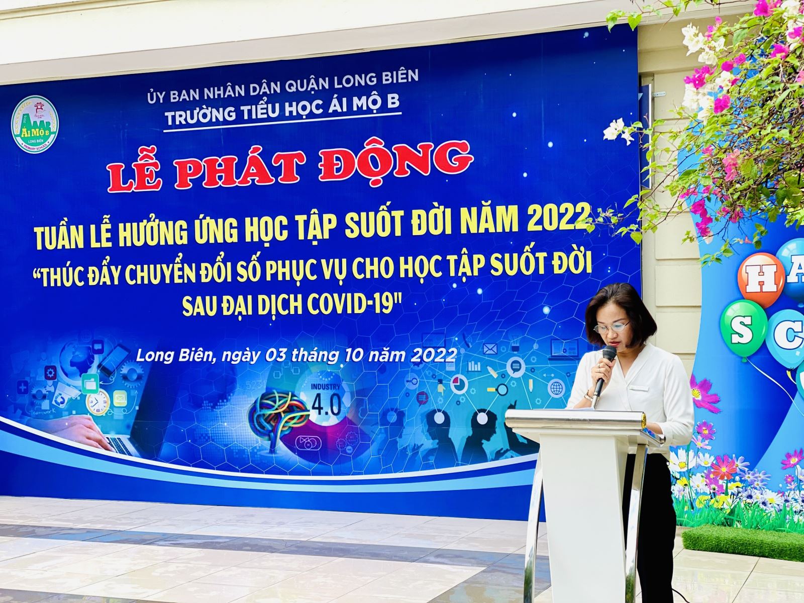 Tại buổi Lễ, cô giáo Phùng Thị Hồng Diên – Phó hiệu trưởng nhà trường đã phát biểu, phát động Tuần lễ hưởng ứng học tập suốt đời năm 2022, nhấn mạnh: Cuộc Cách mạng 4.0, chuyển đổi số, công nghệ số được xác định là nền tảng thực thi của xây dựng xã hội học tập trong giai đoạn hiện tại và tương lai. Các hoạt động dạy học, hội họp và làm việc đã chuyển nhiều sang trực tuyến trên nền tảng của chuyển đổi số, công nghệ số. Để thực hiện hiệu quả công tác xây dựng xã hội học tập gắn với chuyển đổi số, cần xây dựng tài nguyên số, cung cấp các phương tiện học tập phù hợp với nhu cầu, năng lực của người học. Mặt khác người học cần phải thay đổi nhận thức, biến nhu cầu thành động lực để vượt qua các trở ngại ban đầu trong tiếp cận, học tập ở môi trường số với 3 năng lực cơ bản của “Công dân học tập”, đó là: Năng lực tự học, học suốt đời; năng lực sử dụng các công cụ tương tác và năng lực xây dựng và thực hiện các mối quan hệ xã hội trong môi trường số, trên nền tảng công nghệ số có nhiều người dùng tại Việt Nam.