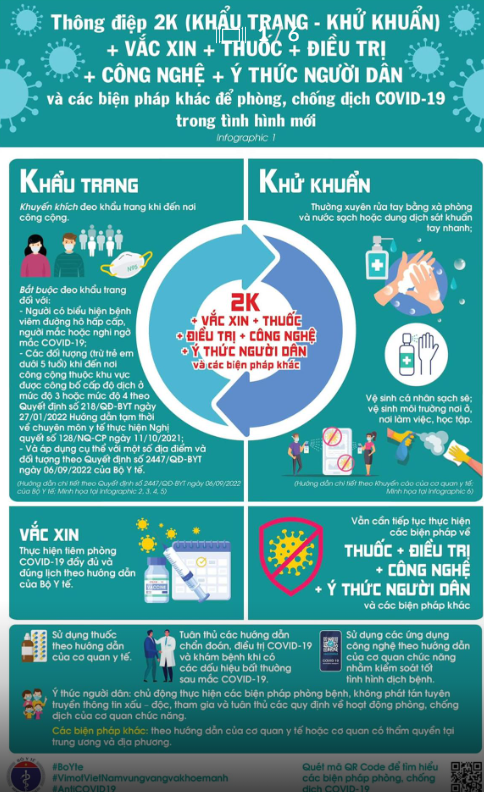 !important; Theo đó, Bộ Y tế thông báo sửa đổi thông điệp 5K thành 2K gồm khẩu trang, khử khuẩn. Cùng đó, Bộ Y tế cũng kêu gọi người dân tiêm vaccine COVID-19 đầy đủ và đúng lịch theo hướng dẫn của Bộ Y tế, kết hợp "thuốc + điều trị + công nghệ + ý thức" trong phòng chống dịch.